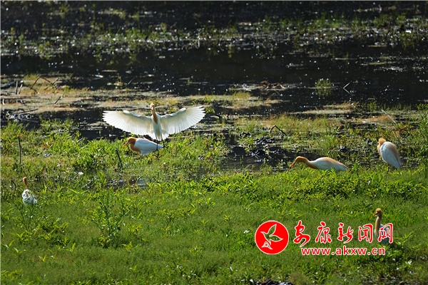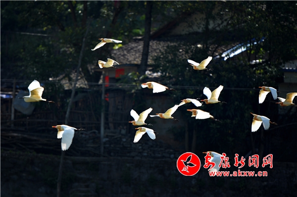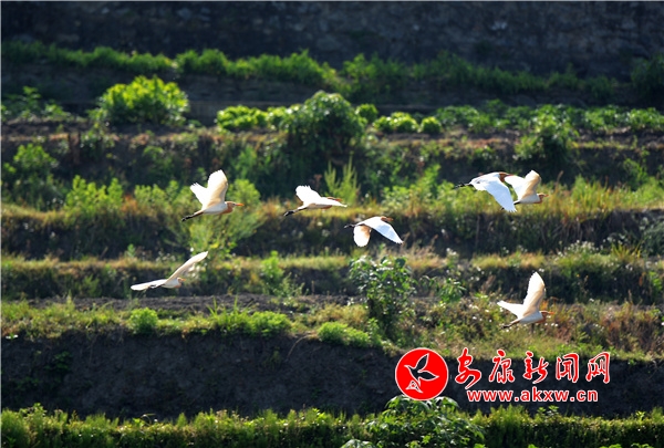 石泉城關鎮(zhèn)生態(tài)環(huán)境持續(xù)向好,在絲銀壩村草池灣翻耕過的農(nóng)田里,30余只牛背鷺時而展翅,時而降落,盡情嬉戲玩耍,撒歡覓食。(圖文/董長松)YSF安康新聞網(wǎng)
