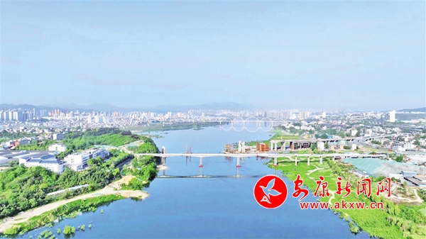 4月16日,安康城東。四橋在靜謐的漢江上倒映出五環(huán),遠處的西城閣和濱江大道與鱗次櫛比的住宅小區(qū)形成了一幅城市風景畫。二橋、四橋相互輝映。 陳梅 攝yF4安康新聞網(wǎng)