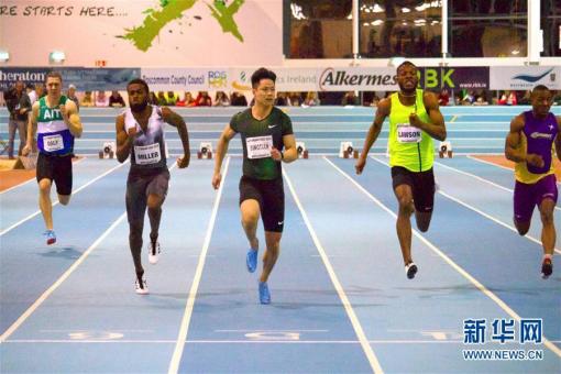 ↑2月13日,中國選手蘇炳添(中)在預(yù)賽中沖刺。 當(dāng)日,在愛爾蘭阿斯隆舉行的室內(nèi)大獎賽中,中國短跑名將蘇炳添以6秒52的成績在男子60米比賽中奪冠并打破賽會紀(jì)……