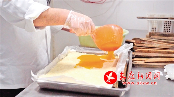 白河肉糕的選材極為講究,以七分肥三分瘦的優(yōu)質(zhì)豬肉、雞蛋、淀粉等為主要原材料,輔以蔥姜等天然香辛料。將豬肉放在展板上用木槌搗成泥后加水攪拌均勻,再與蛋清、淀粉等按比例調(diào)和。隨后把蘿卜切成條塊,在蒸籠里擺成長方形模具狀,填入搗好的肉泥,蒸上十分鐘;待初定型后,去籠,往肉糕上均勻涂抹蛋黃,每蒸五分鐘涂抹一次;三次過后,正宗的肉糕就做成了。