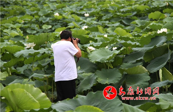 在荷塘間,游客們徜徉其中,賞花拍攝,成為雙乳鎮(zhèn)盛夏的一道亮麗風(fēng)景。密密層層的碧綠荷葉滾動著晶瑩的水珠,一枝枝粉紅色、雪白色的荷花亭亭玉立,散發(fā)著淡淡的幽香。站在對面的山上極目遠眺,大片的荷花在陽光的照耀下顯得分外妖嬈。