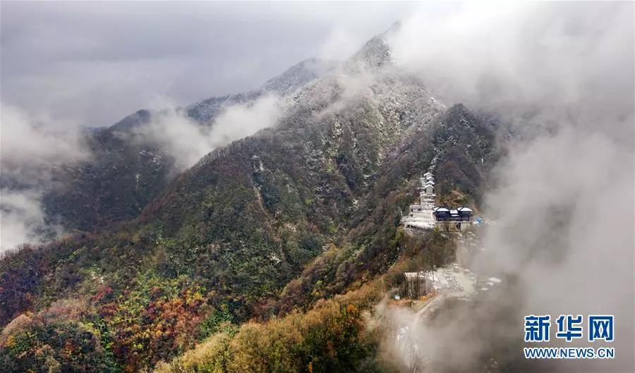云霧中的鬼谷嶺國家森林公園山頂白雪皚皚,山腰秋色正濃(11月8日無人機拍攝)。 新華社記者陶明攝