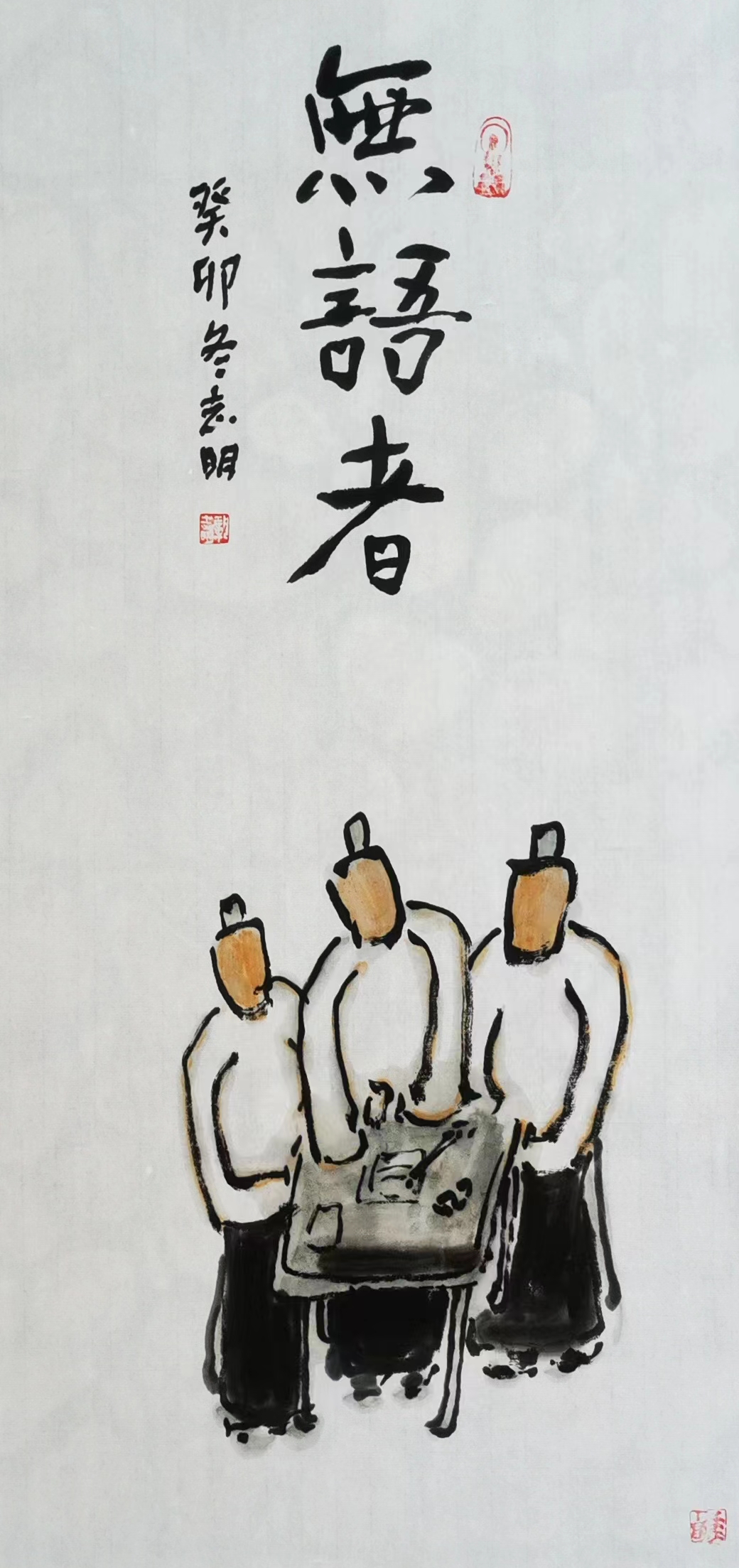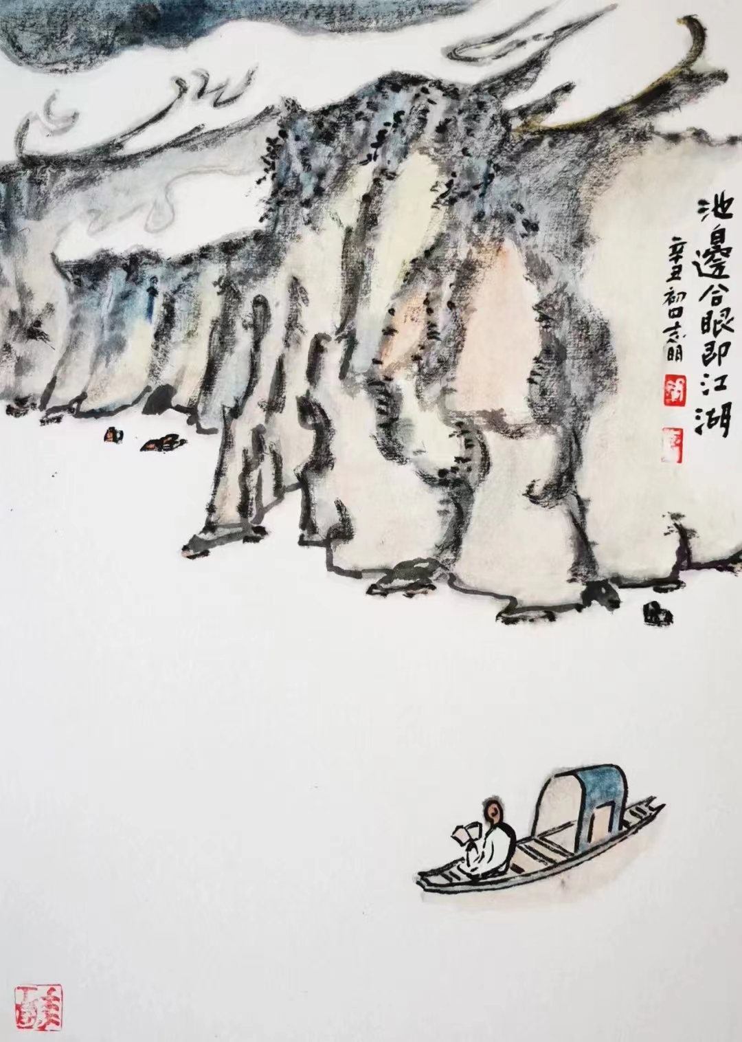 記得那一年的端午節(jié),鞏志明發(fā)來短信,是他寫的一首詩:綠粽黃酒聚江邊,白帆紅燭祭屈原。三千清淚流不得,九萬渾念飄上天。誰有郁悶誰散淡,何謂圓滑何忠奸。十丈風塵古今在,談笑真?zhèn)位聼煛?017年,我遷新居,鞏老師為我寄來小品畫《福到眼前》,我很喜歡,并懸掛至新居玄關。這些年,鞏志明老師常做影展畫展策劃及影評講座,自已也臨池不輟,水墨丹青,寄情抒懷,他的文人小品有思想性、有創(chuàng)造性。雖畫的是松風明月,小舟流水或遠古人物,但都寄托了他當下的心境,以消塊壘。誠如有人評論他為“吾師真文人,畫亦真性情!”他不僅只是身居畫室的怡情文人,他亦是心憂天下的豪俠。面對世間不平事,他也是激揚文字,揮斥方遒!在功利的當下,鞏志明尤其顯得難能可貴!
