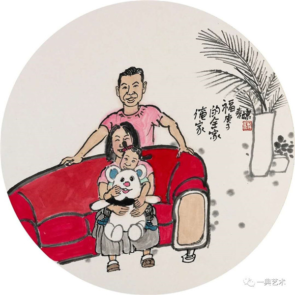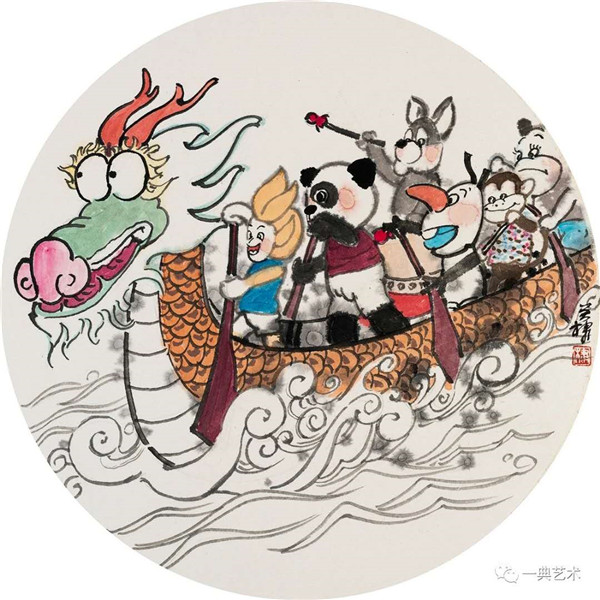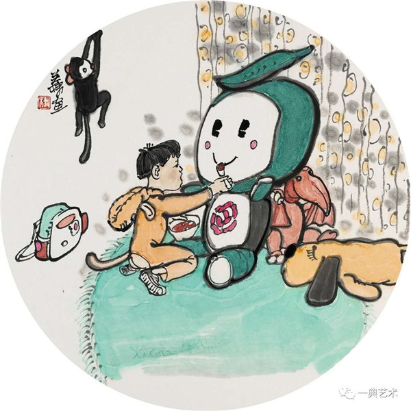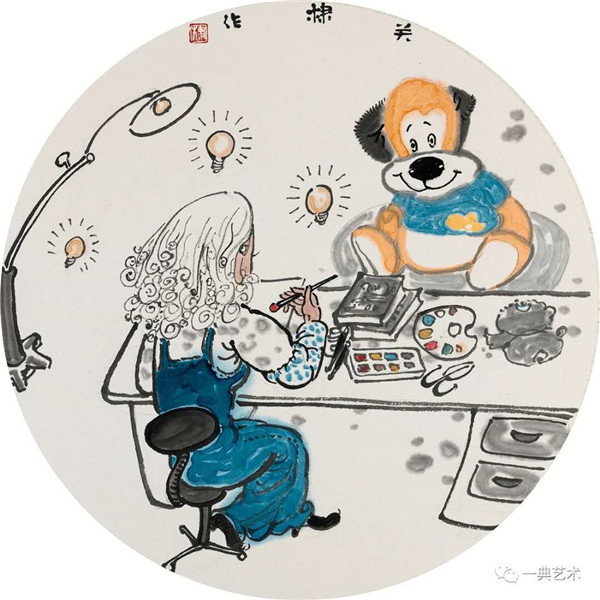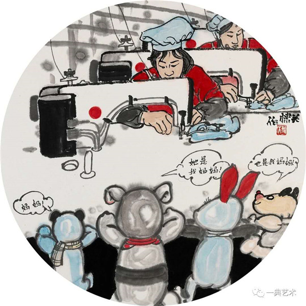 創(chuàng)作這個(gè)題材,我思考的內(nèi)容是豐富的,表達(dá)方式是明晰的,創(chuàng)作沖動是豐沛的。在初期,當(dāng)沒有門徑的時(shí)候,曾經(jīng)請人社局根據(jù)文字資料“劃重點(diǎn)”,而人社局領(lǐng)導(dǎo)給了很寬泛的態(tài)度:沒有重點(diǎn),只要和毛絨玩具相關(guān)。這一態(tài)度實(shí)際上解放了我的思想,放開了我的手腳:尋求有約束的自由——給以充分自由——自我追尋“有約束”的自由。好吧,自己給自己尋找方向!考察結(jié)束,創(chuàng)作方向已經(jīng)確定:以人和毛絨玩具作為主要表現(xiàn)內(nèi)容,以中國水(彩)墨畫為形式。在那幾天(直至今日)我頭腦里充斥著毛絨玩具和女工的形象,兩者形異神同,就像《西游記》中人神共處。因此,創(chuàng)作中我將人和物都以“人”的精神面貌進(jìn)行刻畫,為了藝術(shù)語言的統(tǒng)一,將人略作夸張,并力求“以形寫神”“形神兼?zhèn)?rdquo;,并設(shè)定一定情節(jié)性、趣味性。實(shí)際上毛絨玩具在設(shè)計(jì)過程中,應(yīng)該是運(yùn)用了文學(xué)領(lǐng)域的比喻、比擬、夸張、類比、通感等修辭手法,這也是我在創(chuàng)作中經(jīng)常用到的手法。我是一個(gè)中國畫家,因此作品強(qiáng)調(diào)中國畫的意蘊(yùn),任何時(shí)候,不忽略筆墨的表現(xiàn)。為了符合這個(gè)產(chǎn)品的特性(裝飾性、時(shí)尚性),我有意識吸取了一些水彩畫的表現(xiàn)語言。無論從思想上、技法上,不脫節(jié)傳統(tǒng)、不疏離當(dāng)代。這種表現(xiàn),(也許)增加了作品的藝術(shù)性。