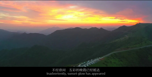 天漸漸亮了起來,越過重重山脈的陽光 映紅了云層,照亮了山谷,催醒了沉睡的動物,一頂頂帳篷像隆起的蘑菇 生⻓在云端之上。